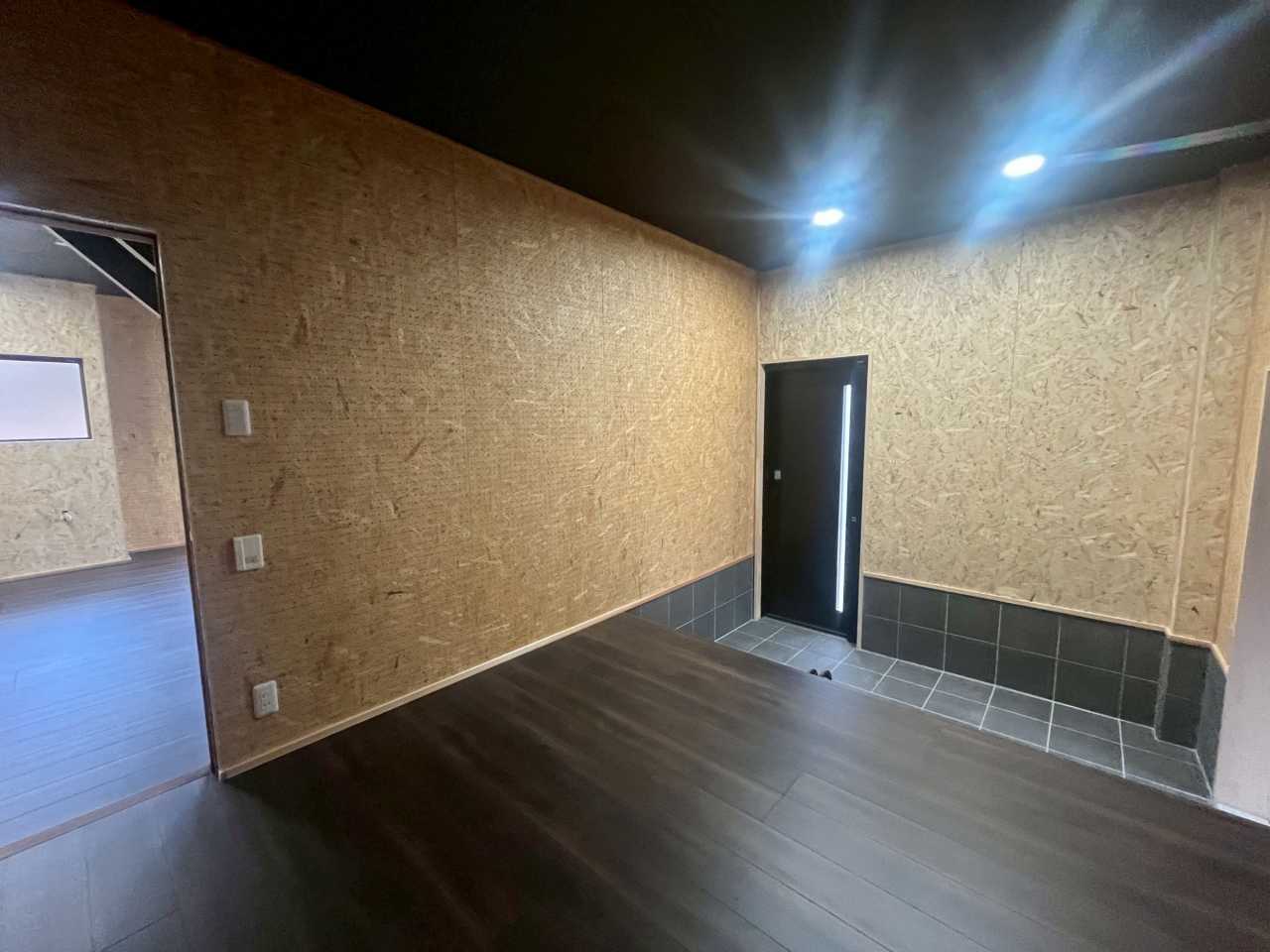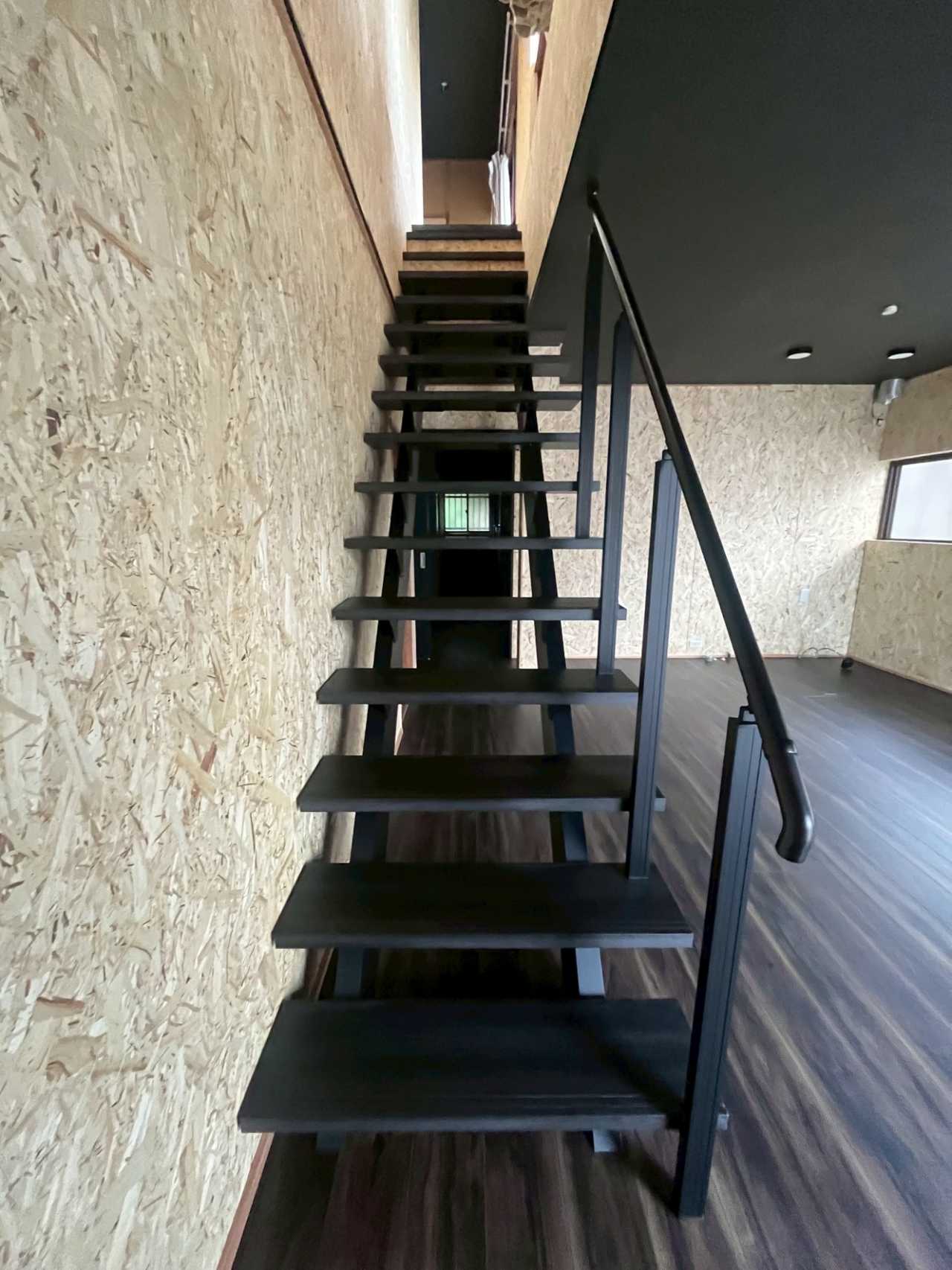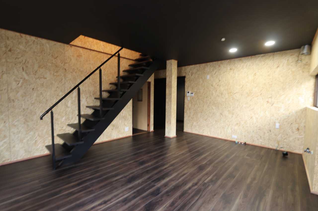 ブラックを基調とした天井、階段。壁はOSBボードで好きな物をディスプレイでき、男のロマンある室内空間になりました。ガレージから室内移動も簡単にできるようになりました。